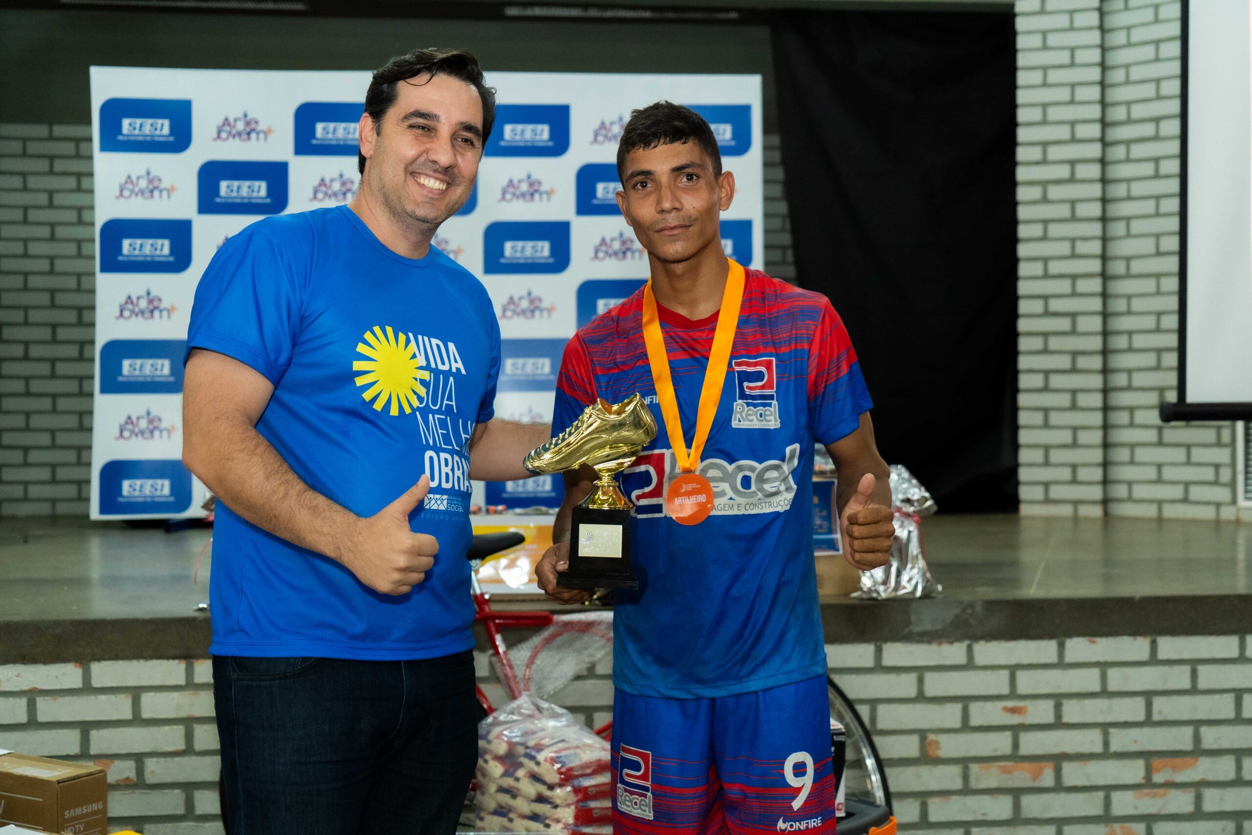 Na oportunidade o empresário doou um voucher de 1 milheiro de tijolo e participou da entrega de medalha e troféus aos ganhadores da 1ª Copa da Construção.